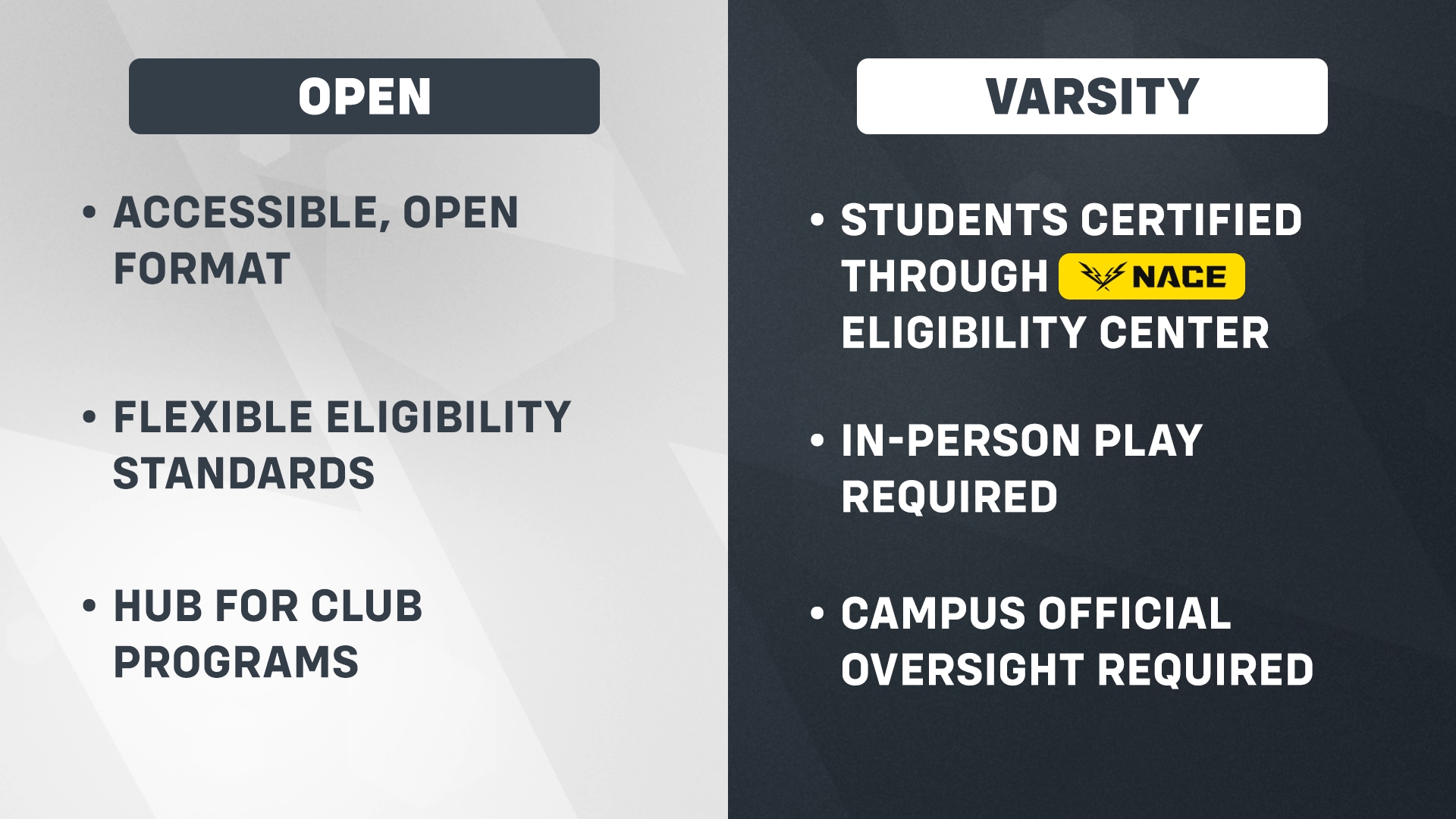 The Championship Varsity Premier Season has several stages. Teams will have the opportunity to compete their way through assigned Regional Groups or Self-Select Conferences over 7 weeks of regular season Round Robin play. The top 32 teams from the Groups stage will advance to the Championship Varsity Premier Playoffs, where they will be pitted against one another in a high-stakes single elimination bracket seeded by the NACE Seeding Committee based on Groups performance. Top teams will be invited to participate in the live event Finals in April.