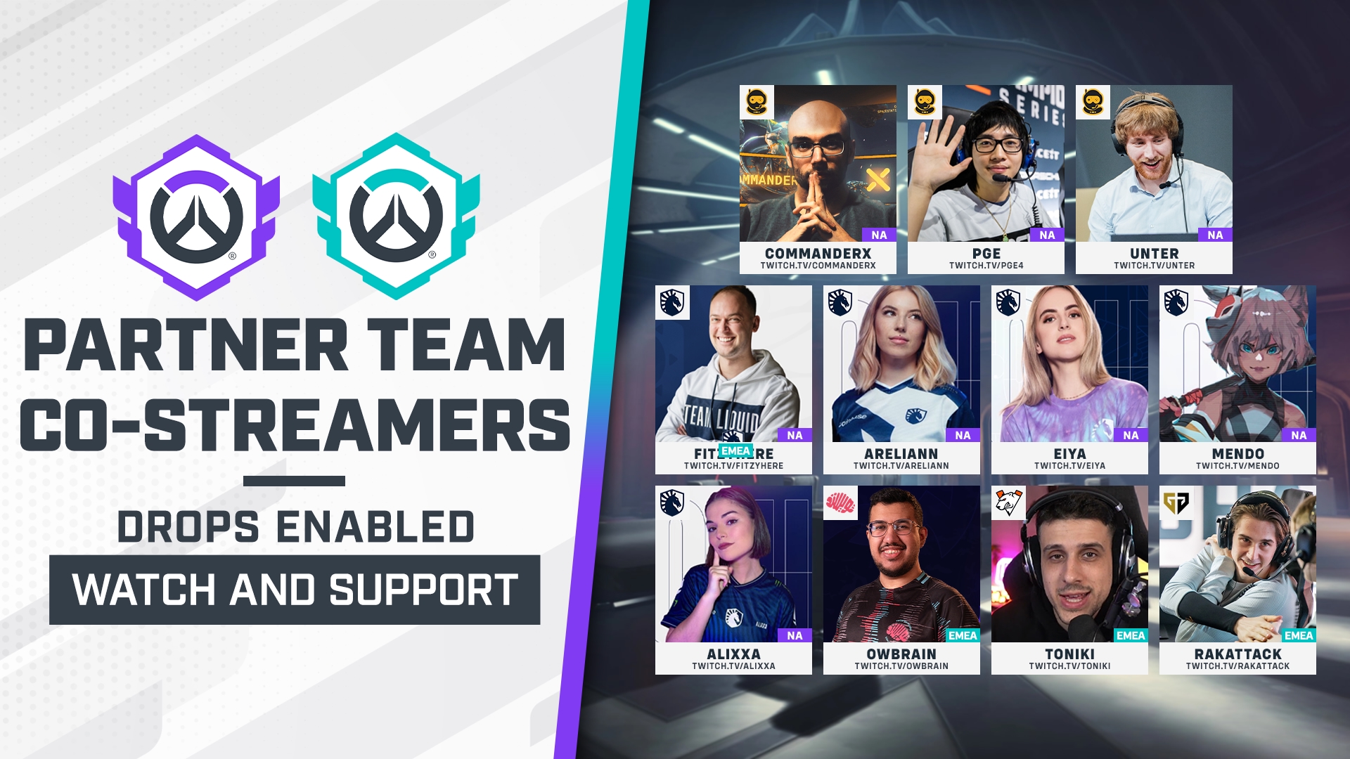 In addition, you can tune in with any of our Partner Team Co-Streamers to earn your drops all year long! These streamers represent some of the best teams in Overwatch Esports, so you know you’re in for a good time.